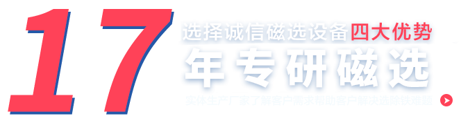 鞏義市誠信機(jī)械廠是河南省內(nèi)多年生產(chǎn)磁選設(shè)備、永磁除鐵器和有色金屬分選設(shè)備的生產(chǎn)廠家,立足磁分選行業(yè)多年,致力于磁分選設(shè)備的研發(fā)和生產(chǎn)制造,公司主營產(chǎn)品有:磁選機(jī)、永磁筒式磁選機(jī)、濕式磁選機(jī)、干式磁選機(jī)、精選磁選機(jī)、小型磁選機(jī)、鈦鐵磁選機(jī)、鋼渣磁選機(jī)、石英砂磁選機(jī)、除鐵設(shè)備、永磁除鐵器、非金屬磁選機(jī)、金屬磁選機(jī)、選鐵設(shè)備、選錳設(shè)備、渦電流金屬分選機(jī)、鋁塑分選機(jī)、渦電流分選機(jī)生產(chǎn)線、不銹鋼分選機(jī)、鐵鋁不銹鋼分選生產(chǎn)線等,用于各種鐵礦粉的精選回收、選廠、鋼廠、電廠、水泥及爐渣、鋼渣、鐵渣和金屬與非金屬中磁性物質(zhì)的篩選作業(yè),我們磁分選技術(shù)成熟,工藝精湛,歡迎廣大客戶到廠區(qū)實(shí)地考察。